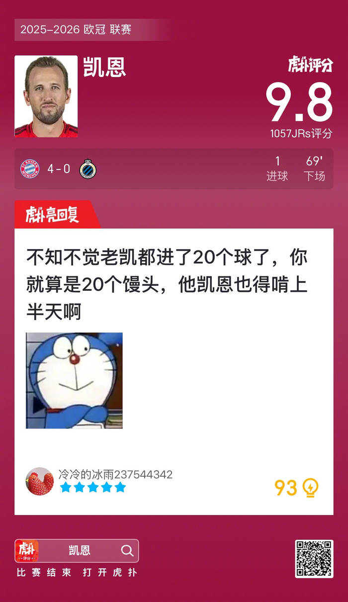 哈里·凯恩这名号天天被拿出来讨论,但今晚他用实际表现把很多质疑先搁一边——一脚进球加上赛后虎扑9.8评分,这不是运气。这分数说明什么?说明他在欧冠舞台还有统治力,关键时刻能拿分也能造势。作为观众,我从他的动作里看见的是老练而不偷懒的杀手本能。